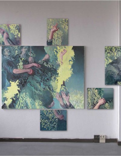 Joana und Heleen probieren für Aeneas trägt Anchises aus dem brennenden Troja, nach Raffael da Urbino, Öl/Lwd., 150 x 120 cm, 2019
