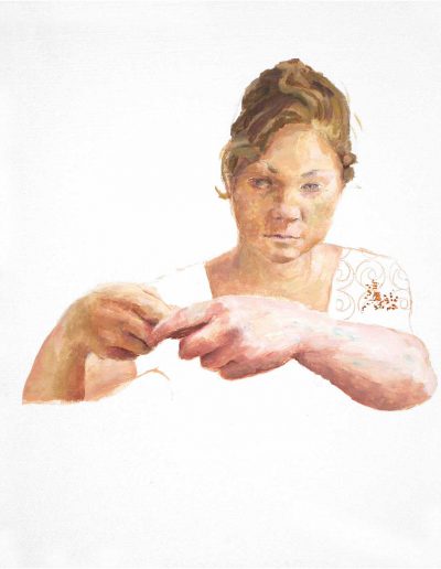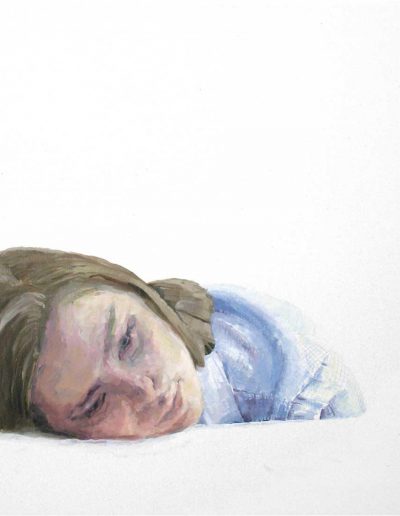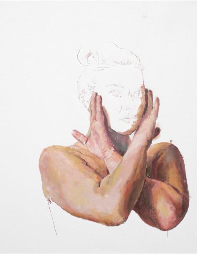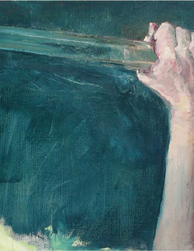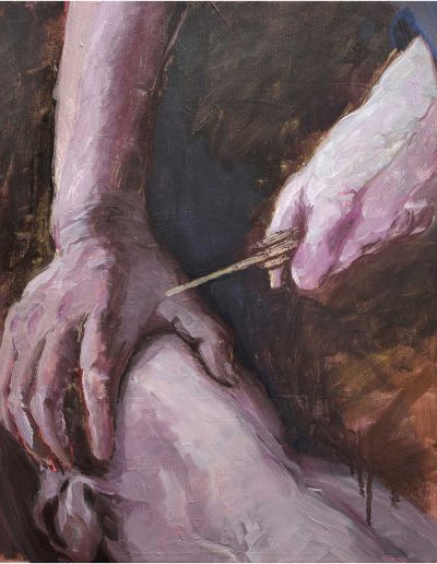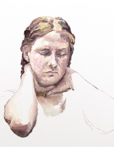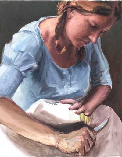 Katharina probiert für »Portia rammt sich ein Messer in den Oberschenkel« – nach Elisabetta Sirani, 30 x 40 cm, blaue Pastellkreide auf Zeichenkarton, 2024