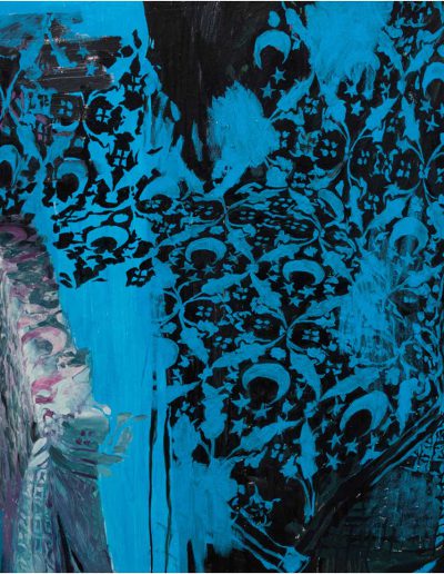 Valerie probiert für Nachrichtensprecherin / Captain Germany, nach Verena Kyselka, blaue Pastellkreide auf Zeichenkarton, 240 × 150 cm, 2022